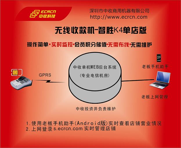 智胜无线收款机内置工业级GPRS通讯模块,客户自行购买开通GPRS功能的手机卡(移动或者联通均可),将卡插入收款机卡槽内,即可投入使用。