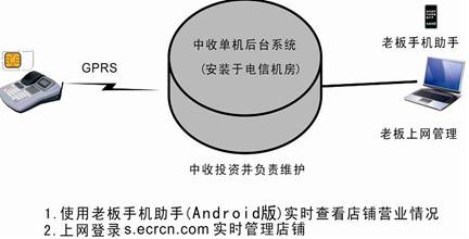 后台(即店铺后台管理系统)设置商品分类,商品PLU信息。前台(即无线收款机)下载数据后,只管销售。销售数据会实时上传到后台,老板不管是在家,还是在办公室、在旅途中,都可以上网实时查看经营情况,实时管理店铺。