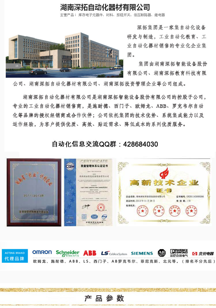 湖南深拓自动化器材有限公司是湖南深拓智能设备股份有限公司 的控股子公司,专业的工业自动化器材销售商,是施耐德、西门子、欧姆龙、 ABB、罗克韦尔自动化等品牌的授权经销商或合作伙伴 ;公司依托集团的 技术优势、系统集成能力以及运作经验,为客户提供 优质、高效、贴近需求、降低成本的系列优质服务。 对进口电气器件的性能更加熟悉和了解,对产品的应用更是得心 应手,也更熟悉 和了解客户需 求,节省中间环节,为客户节省成本; 专业的服务队伍 能够一对一的服务于客 户,为客户解决后顾之忧。 。 。。。。。。