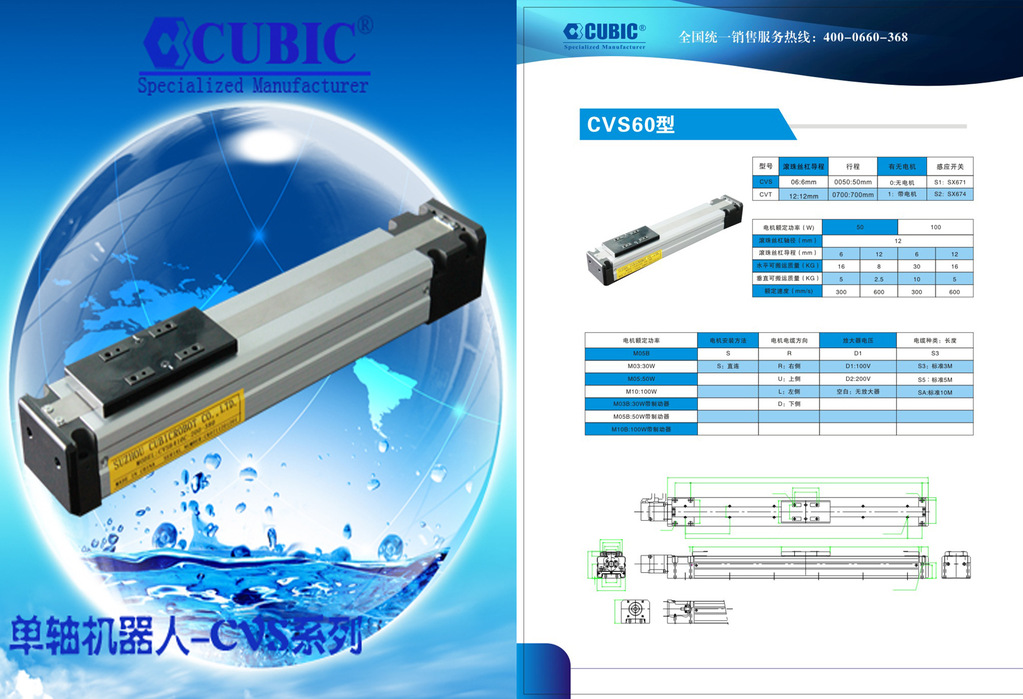 微小型-CVS系列产品全部符合RoHS指令的要求。CVS-45系列标准配备30W伺服马达,导程为2mm;CVS-60系列标准配备50W或100W伺服马达,导程分为4mm和5mm可供用户选择