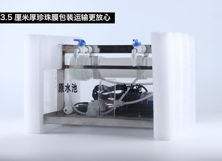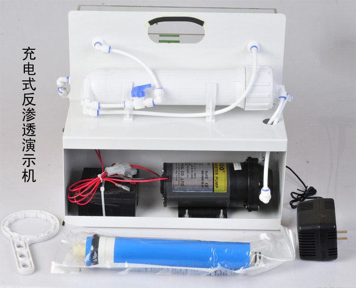 向有机玻璃原水盒内加满水,接通电源,蓄电装置有点的话,打开电源开关,启动纯水演示机增压泵。纯水机演示机可以连续工作,循环制水。