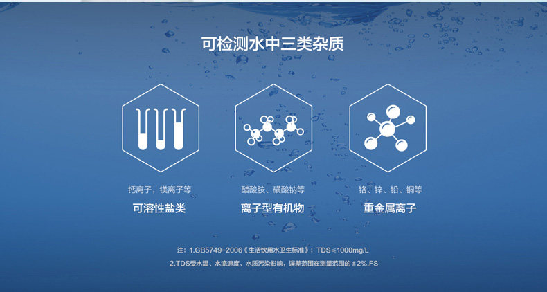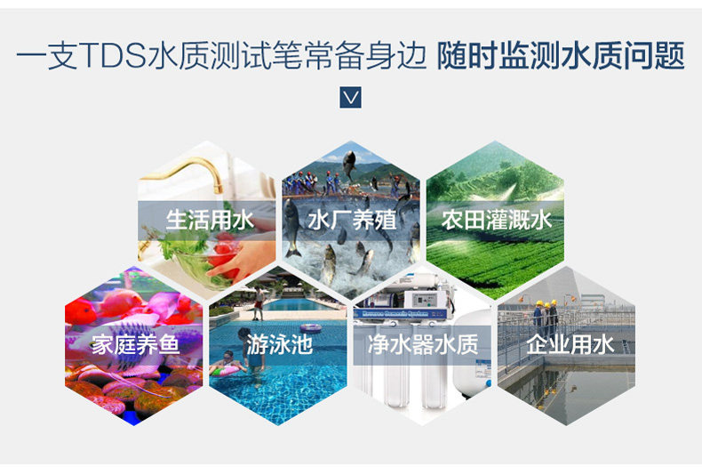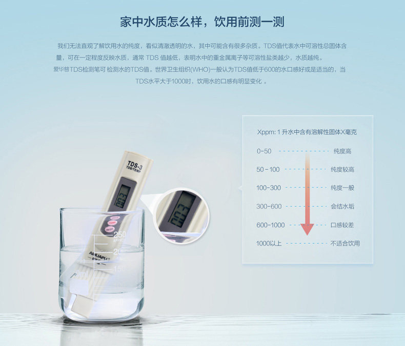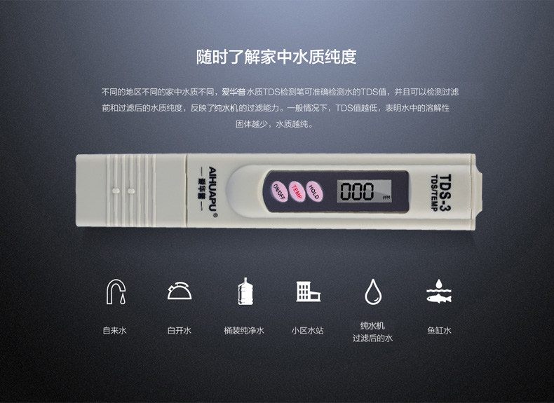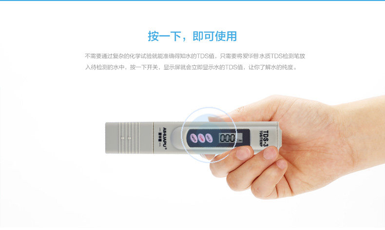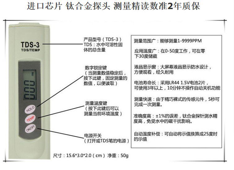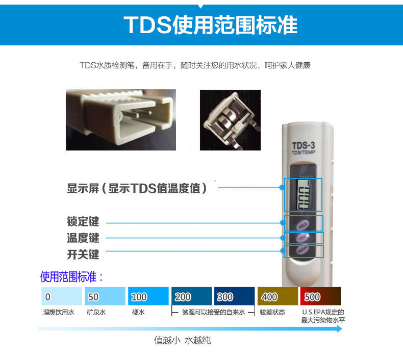 使用注意事项:避免将TDS笔浸泡到水里,避免直射光线和高温,避免撞击重压和摔落。