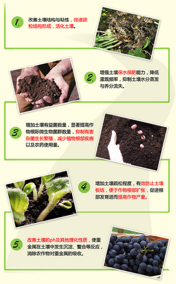 4.富集养分:在堆肥的过程中养分由无效态和缓效态变为有效态和速效态;形成具有优良吸水保湿特性的聚麸胺酸(γ-PGA)天然材料,防止肥份和水份的流失,成为土壤良好的天然保护膜,从而达到富集养分作用。