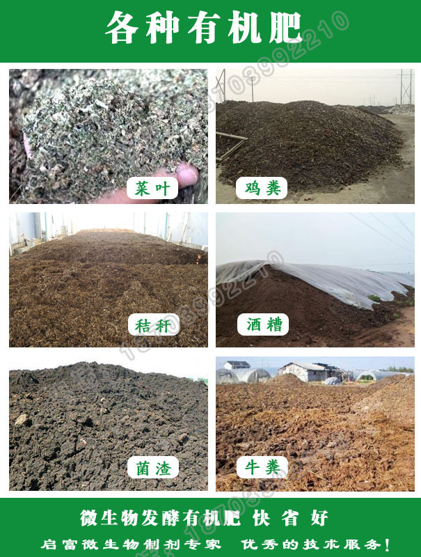 发酵物料:制作有机肥,可以发酵鸡粪,鸭粪,猪粪,牛粪,羊粪,鸽粪等人畜粪便来做有机肥,还可以发酵花生麸,菜籽饼,油枯,糖渣,蘑菇渣,秸秆,杂草等做有机肥。
