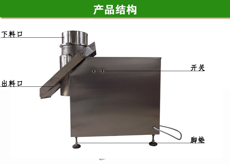 本机适用于制药、食品、化工、轻工等行业,将潮湿的粉末碾成所需的颗粒,亦可用于将已压成块状的干粉粉成颗粒。本机操作简单,维修方便,清洗容易,自动出料。并可根据用户需要选择不同孔径的筛筒,与物料接触部位均采用不锈钢材料制成,能确保物料的而不变质
