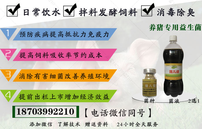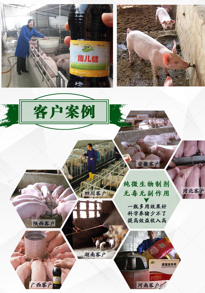 启富厂家专注研发养猪用的em益生菌,猪饮水益生菌,猪饲料发酵剂,豆渣发酵剂,酒糟发酵剂,猪舍除臭消毒液等。针对猪饮水,猪免疫力低,经常拉稀生病,豆渣喂猪,酒糟喂猪,猪舍氨气重,臭味大等问题推出的猪儿健产品,可以用于猪饮水,发酵饲料,猪舍除臭,效果好,一品多用成本低。全国各地均有客户使用,如:河南,四川,广西,安徽,湖南,陕西等地,使用客户达到28万之多。
