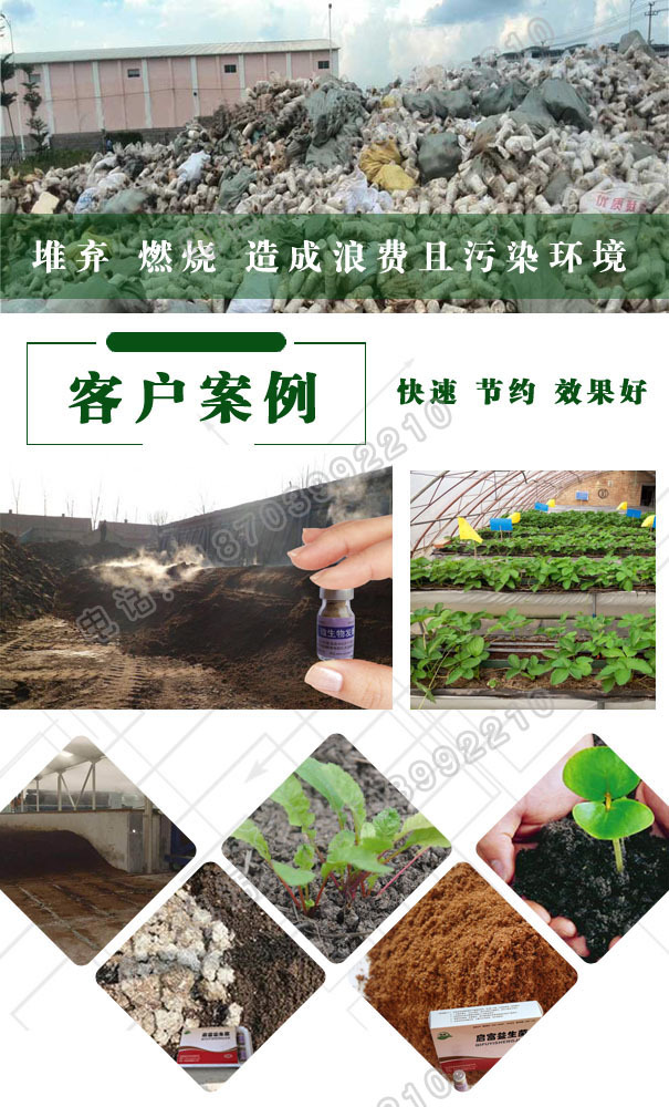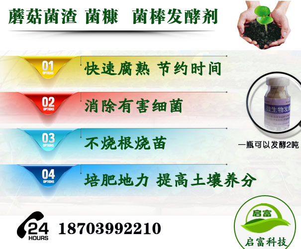 蘑菇渣发酵剂,启富厂家专注有机肥发酵剂的研发推广销售,针对腐熟蘑菇渣发酵慢,烧根烧苗,肥力底下,传播病虫害等问题推出的微生物发酵剂产品,它属于纯微生物发酵剂,可以快速发酵,避免烧根烧苗,预防传播病虫害,预防土壤板结,培肥地力等,效果显著。启富厂家面对全国销售,欢迎新老客户咨询订购(王经理 187-0399-2210)