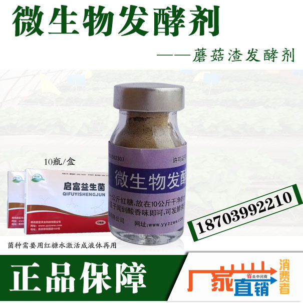 启富微生物发酵剂产品介绍: 微生物发酵剂:原菌种,粉剂,一瓶15克,一盒10瓶,可以发酵20吨的蘑菇渣有机肥。菌种需要提前配置成菌液方可使用。 产品成分:由放线菌、乳酸菌、芽孢杆菌、光合菌、酵母菌等单一菌种经特殊工艺研制而成的高-效复合微生物菌。可以抑制有害病菌的滋生,快速发酵腐熟,提高肥力,防止烧根烧苗,预防土壤板结,培肥地力。 发酵物料:本产品是专门发酵有机肥的发酵剂,可以发酵的原料除了蘑菇菌渣、菌糠、菌棒外,还可以发酵糖渣,糠醛渣,杂草,秸秆、花生麸,人畜粪便等做有机肥。