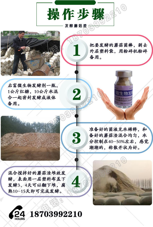 启富微生物发酵剂订货方式: 1、电话订购银行汇款后公司安排发货。 2、联系厂家客服通过淘宝购买。 3、厂家联系电话:18703992210 Q/Q:1530645525 sx01zzb1405 蘑菇渣发酵剂价格|发酵蘑菇渣做花卉底肥方法|怎么处理蘑菇渣可以种蔬菜|处理蘑菇菌渣菌糠做基肥方法技术|