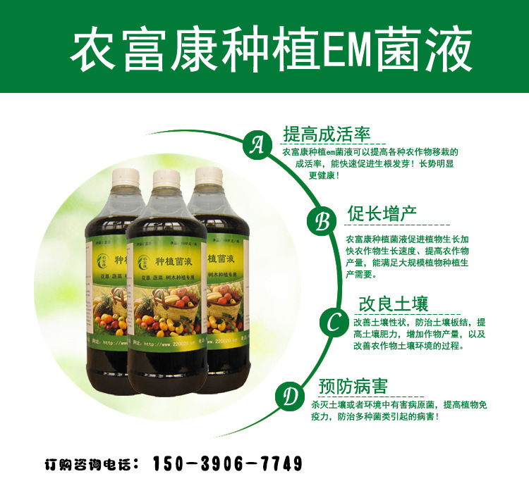 农富康种植菌液稀释液,一茬作物应不少于2 - 3 次,次数越多,效果越好最好每周1次。亦可用EM粪水稀释液浇根追肥,效果更好。