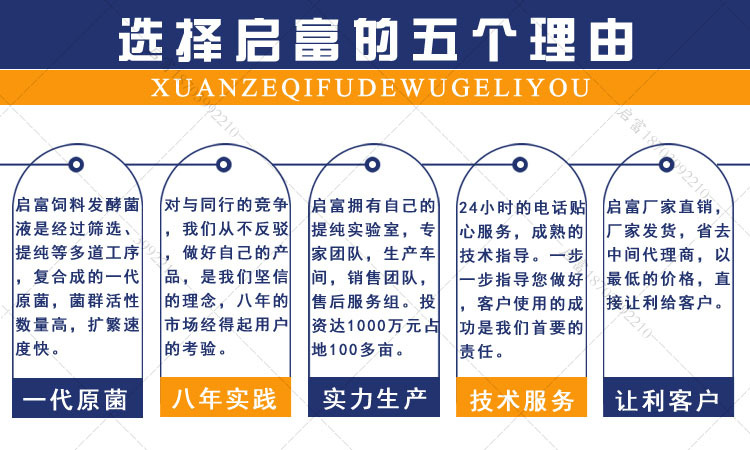 选择启富饲料发酵剂的理由: 市面上的微生物发酵剂种类繁多,价格不一,当你在选择的时候一定不要让价格左右了你的想法,产品质量,效果才是关键,选择有生产实力,有技术经验的厂家合作才是出路。启富公司专注生产饲料发酵剂八年,全国客户高达28万之多,工厂占地100多亩,有自己的实验室,生产车间,一流的专家团队,24小时的售后技术服务指导,省去代理商直接的出厂价格。