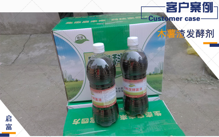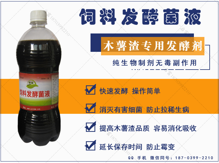 启富饲料发酵菌液---木薯渣专用发酵剂产品介绍: 规格:1公斤/瓶 12瓶/箱 成分:本产品由放线菌、乳酸菌、芽孢杆菌、光合菌、酵母菌等单一菌种经特殊工艺研制而成的高效复合微生物菌。纯微生物制剂,安全放心,对动物没有任何副作用。 含菌量:500亿/克 保质期:18个月 生产厂家:郑州启富农业科技有限公司