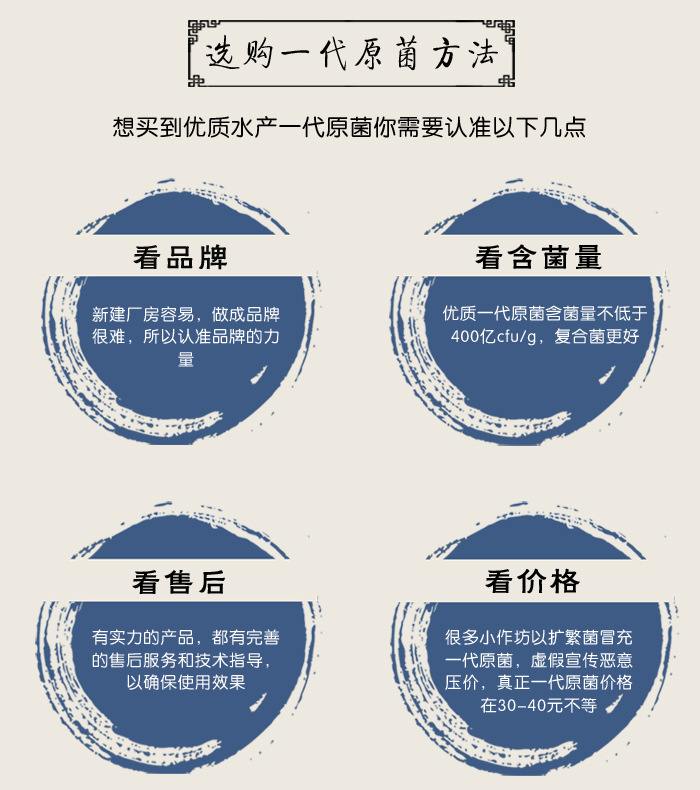 市面上很多养虾用的EM菌都是 扩繁菌,经过他们厂家扩繁后出售的,其特点是不需要自己培育,按公斤出售直接干粉撒塘使用。不是很懂行的虾农感觉干粉直接撒塘很方便,但是你忽略了效果,益生菌扩繁后在干燥环境下会不断衰亡,活菌量越来越少,到你手里使用时效果往往没有保障。如果EM菌种扩繁后一直保存在液体环境中,菌可以长期存活,如果是自己培育EM菌种,那么配好的菌液中活菌量更多,毕竟活菌才是效果的保障,宣传的含菌量再高都是死菌,又有什么用。市场上EM菌种的价格在30-40元不等,而扩繁的菌粉只有几元一公斤的价格,一分价钱一分货,为了您的利益请谨慎选择。