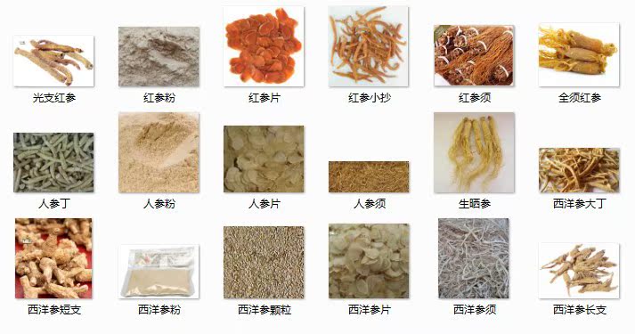 人参粉、人参颗粒、白直须、人参全须、人参丁、人参片、红参全须、红参小抄、红直须、红参片、红参颗粒、红参粉、红参投料、西洋参长支、西洋参短支、西洋参原尾、西洋参颗粒、西洋参丁。