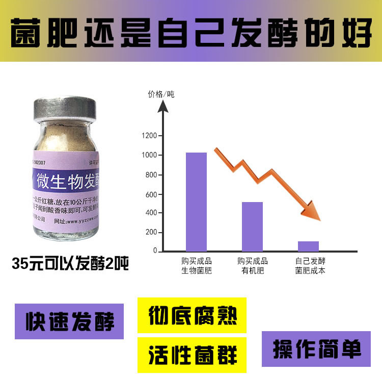这里我们推荐使用启富生物菌肥发酵剂,采用腐熟剂发酵技术,能分解蛋白质、纤维素、半纤维素、木质素等,并将嗜热、耐热细菌、真菌、酵母菌菌株及相关分解酶复合而成,其有效活菌数含量高,降解能力强,同时能够达到升温、除臭、消除病虫害、杂草种子和提高养分的效果。在适宜的条件下,能迅速将堆料中的碳、氮、磷、钾、硫等分解矿化,形成简单有机物,从而进一步分解为作物可吸收的营养成分。