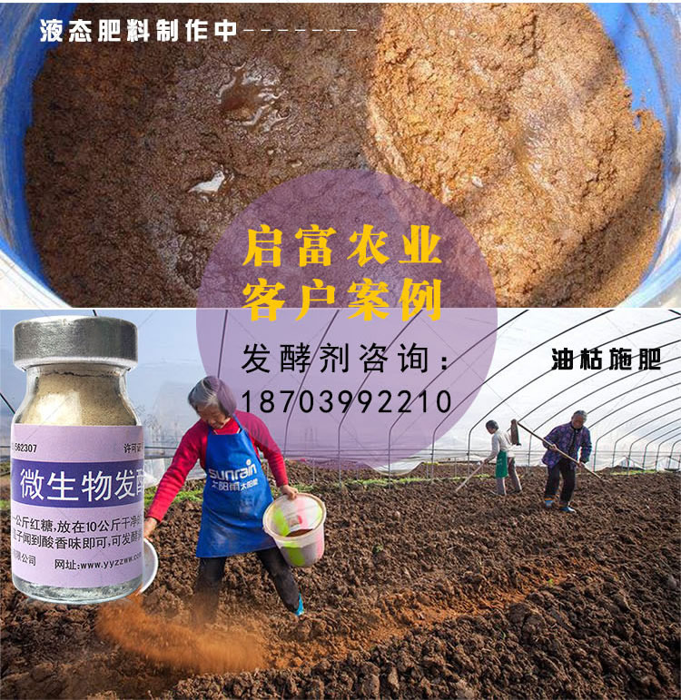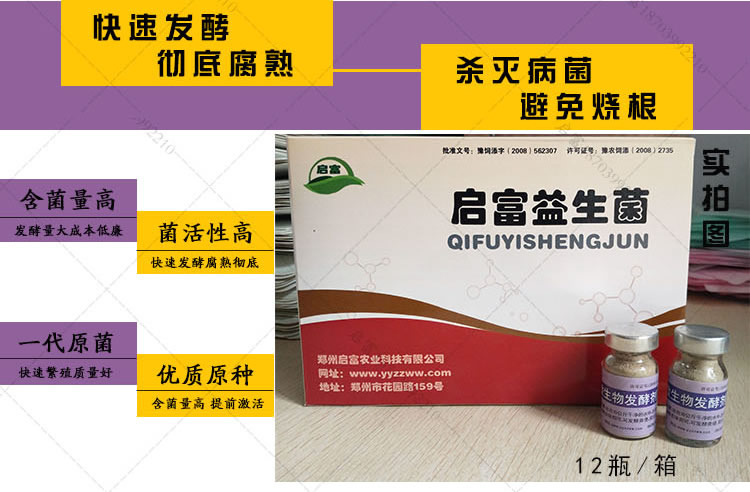 产品成分:由放线菌、乳酸菌、芽孢杆菌、光合菌、酵母菌等单一菌种经特殊工艺研制而成的复合微生物菌。可以抑制有害病菌的滋生,快速发酵腐熟,提高肥力,防止烧根烧苗,预防土壤板结,培肥地力。