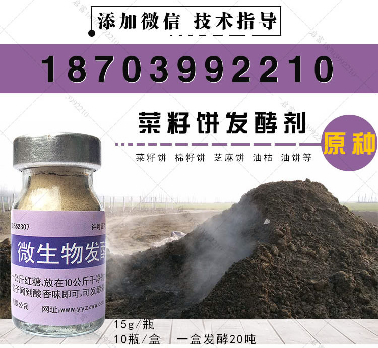 发酵物料:本产品是专门发酵生物菌肥的发酵剂,可以发酵的原料除了菜籽饼、棉籽饼、芝麻饼、油枯外,还可以发酵糖渣,糠醛渣,杂草,秸秆、花生麸,人畜粪便等做有机肥。