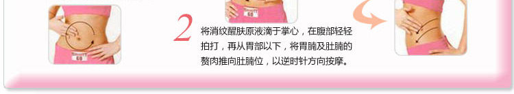 2、将消纹醒肤原液滴于掌心,在腹部轻轻拍打,再从胃部以下,将胃腩及肚腩的赘肉推向肚腩 位,以顺时针方向按摩。 3、将腰间两旁的赘肉向内及往下推做按摩,重复10次左右。 |