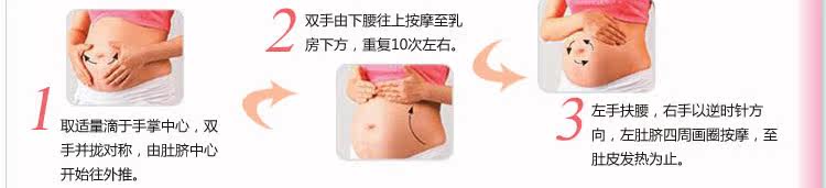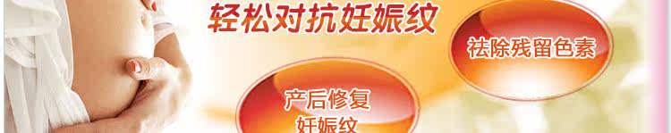 预防和消除色素沉着,孕期除瘙痒,减缓皮肤干燥老化,激发纤维组织再生,提升皮肤自体复原力,有效预防产前妊娠纹,修复产后妊娠纹。