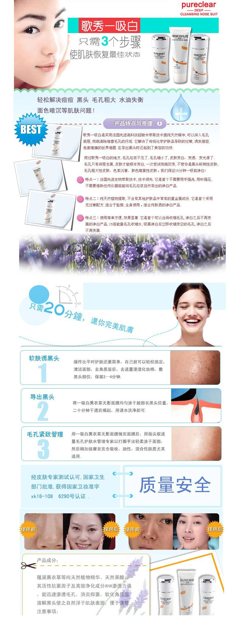 | 规格 | 1号软肤诱黑头精华液, 2号吸白熏衣草无影面膜, 3号毛孔护肤水管理专家(各80毫升) | |