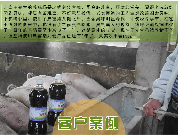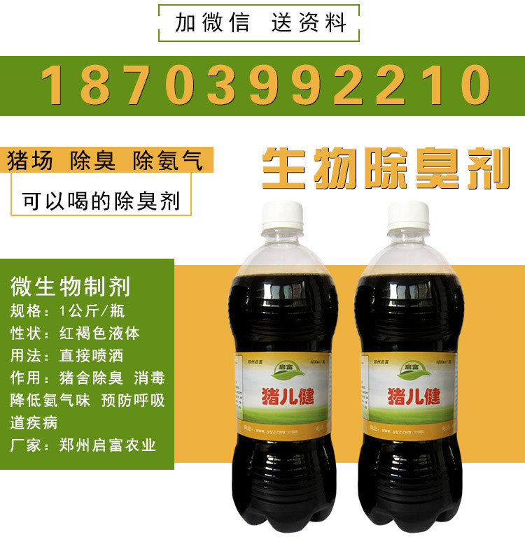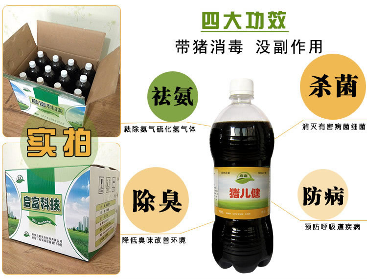 为了可以长期保证猪舍空气环境健康,减少粪便恶臭,一般我们可以采用喷洒+食用的方法来解决粪便臭味的问题。启富猪儿健产品是专门给养猪户用的微生物制剂产品,本品含有放线菌、硝化菌、乳酸菌、芽孢杆菌、酵母菌等80多种活性有益菌复合而成,可以快速降低圈舍氨气,硫化氢等有害气体,还可以提高猪的抵抗力,减少生病率,促使猪的肠道对饲料的消化吸收,是排出的猪粪中氨氮含量降低,从而降低了猪粪在氧化过程中所产生的恶臭。
