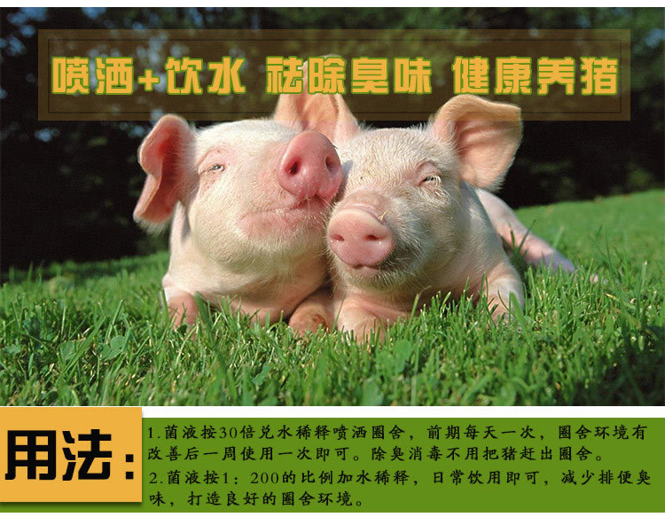 使用猪儿健给猪场除臭的方法很简单:1公斤的猪儿健活性菌液加30-50公斤的清水稀释后喷洒即可(一般可以喷洒100-150平方左右),喷洒后2-3个小时即可感受到臭味降低。另外可以添加到饮水或猪饲料中,给猪吃,猪儿健是多种益生菌复合的有益菌产品,给猪食用,可以保健促长,从根本上解决猪粪恶臭的问题,1公斤的猪儿健菌液加到200公斤的水或饲料中,给猪吃即可,简单方便。
