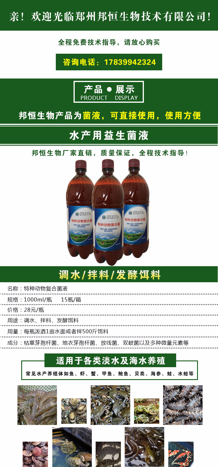直接泼洒水中用于调节水质、降解亚硝酸盐、降低氨氮含量、降低PH值、发酵有机肥、池底改良、增加溶氧量、杀菌消毒等,也可发酵饵料或者直接拌料投喂。有效提高饵料利用率、吞噬池塘中有害病菌、预防多种鱼类疾病,尤其对皮肤病及肠胃疾病效果显著;通过益生菌作用原理,避免水质过肥,过淡、增加水中的溶氧量;水体投放郑州邦恒水产菌液发酵后的动物粪便可避免水体污染,使用郑州邦恒水产菌液可增加浮游生物为鱼、虾、蟹等提供丰富的生物饵料。 |