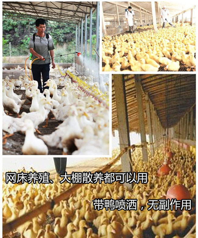 3、一瓶除臭消毒液可喷洒150-200平米鸭舍,除臭除氨气消毒多重作用,减少鸭呼吸道疾病、细.菌性疾病,提高养鸭效益。蛋鸭、肉鸭高密度养殖,应少量多次喷洒,每次用量减小,加大喷洒频率。