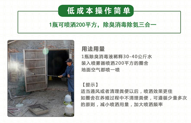 1瓶除臭消毒液兑水30-40公斤,喷200平米鸭舍,用喷壶,把地面、空气、墙壁、彻底喷一遍,鸭身上也喷喷, 选在晴天中午温度高时喷效果更佳,菌活性受温度影响,温度高活性强,除臭快,如果有窗户的鸭舍,喷完后1小时再开窗通风,特别适合鸭苗育雏室。