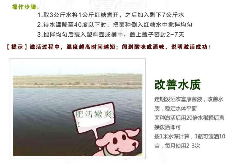 农富康水产EM菌种需激-活后再用,激-活方法:1瓶养虾专用EM菌种+10公斤红糖水发酵即可,发酵好的即是水产EM菌液。