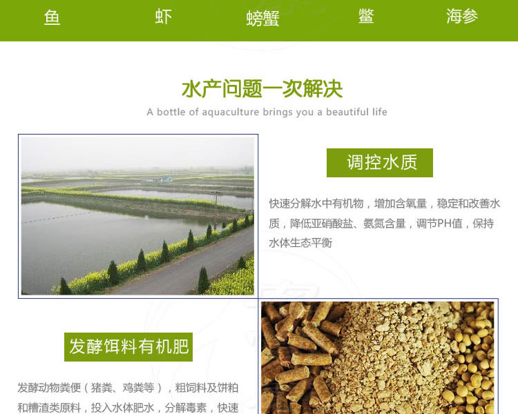 分解池塘底部淤泥的有机物(残饵、粪便、池底淤泥及死藻及其它飘浮有机物),处理水浑浊水发黑发红问题,改底清底,改善水体环境,降解氨-氮、降解亚-硝-酸-盐,使池塘没有硫-化-氢、氨-氮等臭味,调节PH值、增加溶氧量。