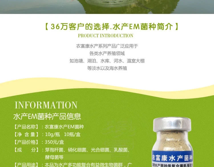 农富康水产EM菌种自农富康生物科技有限公司05年成立以来就开始下线生产,农富康水产EM菌种是复合型EM菌益生菌,其主要成分为乳酸菌、酵母菌、双歧杆 菌、醋酸菌、放线菌、芽孢杆 菌等10属80余种有益菌,功能强大,是一款专门用于水产养殖的EM菌剂复合微生物制剂,购买农富康水产EM菌种量大从优,另赠送产品使用说明资料书。订购咨询来电:150-3906-7749