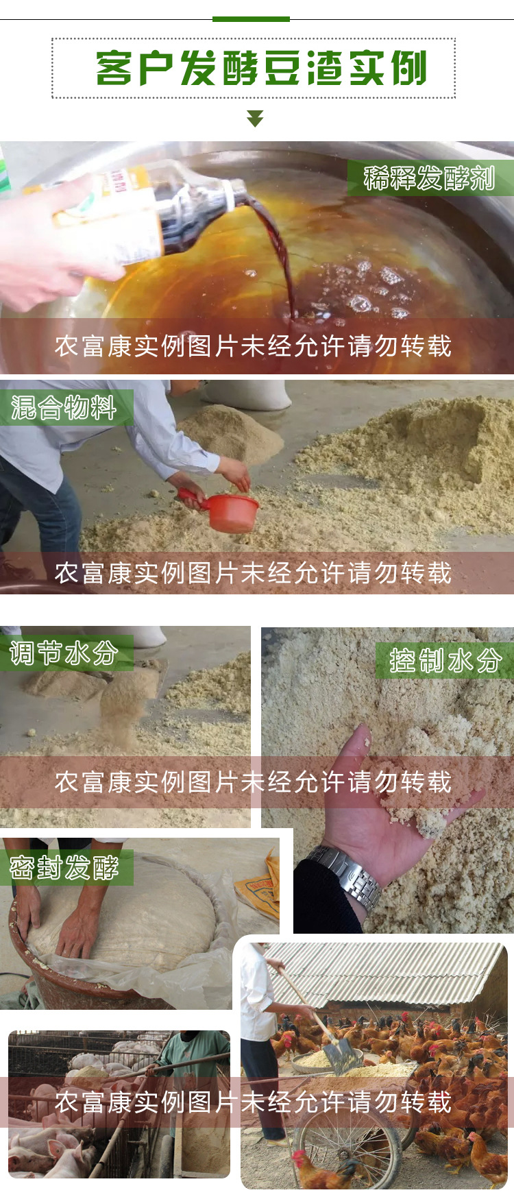 4:防拉稀防病:豆渣做猪饲料,如果不发酵很这容易使猪拉稀等肠胃疾病,农富康豆渣发酵剂发酵的豆渣可有-效消-灭豆渣中的各类有害菌,预防因饲喂豆渣引起的拉稀等各类肠道疾病;
