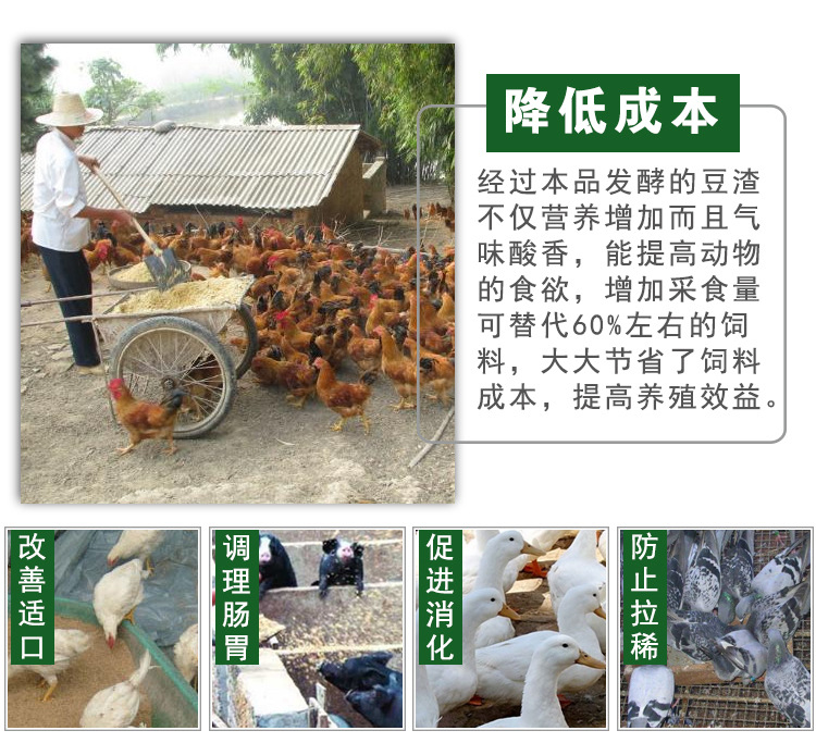 5:提高饲料的吸收利用率:降解豆渣中的抗营养因子,发酵出来的豆渣营养更容易被猪吸收。起到促-长催-肥的作用。
