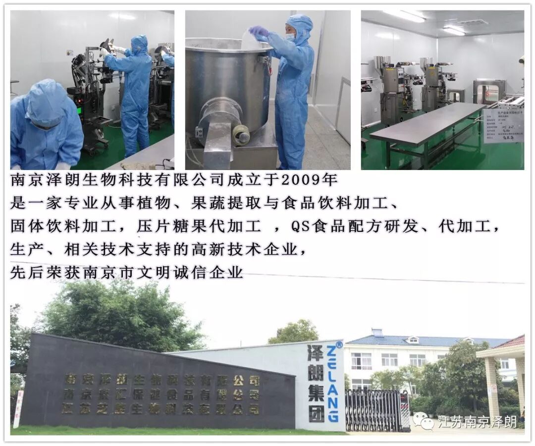 南京泽朗生物科技有限公司,是一家专业从事植物、果蔬提取 大健康产业产品代加工贴牌业务:(工厂可以代工:固体饮料,压片糖果,30ml/50ml/100ml/口服液饮品,果浆原浆 代餐粉,保健品 )食品配方研发、代加工,生产.一站式服务厂家提供的技术服务,专业代加工、加工定制,来料加工(OEM)、包工包料(ODM)、来样加工,加工产品贴牌一系列的产品!我们拥有多年丰富的OEM加工经验,能够准确按照贵公司的需求生产出指定品牌的成品。在正式生产前,我们首先严格确认贵公司的产品样板,并将建立一整套质量和技术工艺的标准,工程师可提供产品开发,技术支持。可为各大新老客户提供OEM贴牌生产。