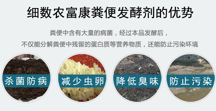 推荐广大养殖户用农富康粪便发酵剂,14年老厂家生产,专用的粪便发酵腐熟产品,微生物活菌制剂,多种益生菌复合,活菌含量高,菌活性强,发酵粪肥升温快,高温可杀菌杀虫/卵,腐熟彻底,分解含硫化合物等有害物质,降低粪肥臭味,安全无药残危害。