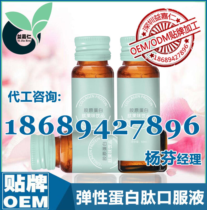 深圳专注弹性双蛋白肽饮品代加工厂家,胶原弹性双蛋白饮品OEM贴牌灌装,鲣鱼蛋白肽口服液代加工,胶原弹性双蛋白饮品贴牌定制,弹性胶原蛋白肽口服液OEM委托加工生产企业,深圳益嘉仁专注于代加工口服饮品,提供一站式OEM服务,及设计、研发、生产、备案、配方、质检等优质增值服务。能生产多种类型、规格的饮料!GMP、SC双认证,一千级净化车间。