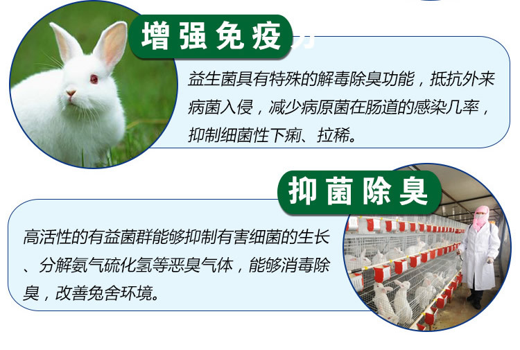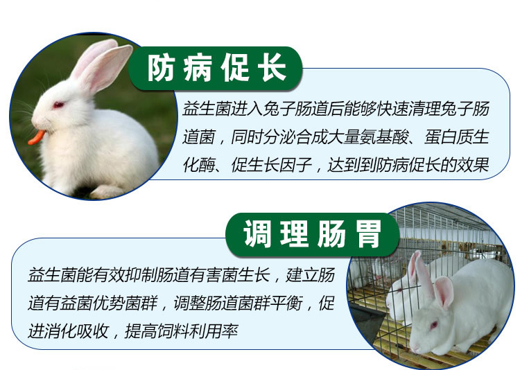 1:农富康养殖益生菌能清理兔子肠道内的有害致病菌,在兔子的体内形成有益菌环境,提高兔子免疫力。