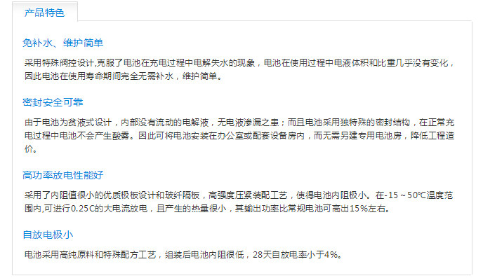 采用特殊设计克服了电池在充电过程中电解失水的现象,电池在使用过程中电液体积和比重几乎没有变化,因此电池在使用寿命期间完全无需补水,维护简单。