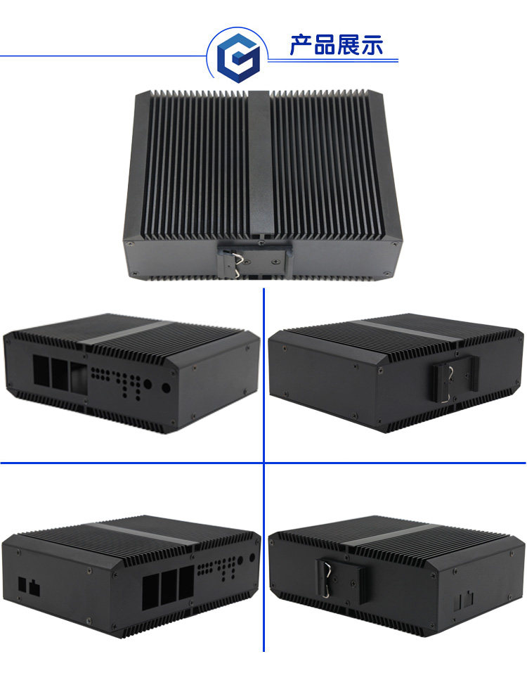 组成结构:铝型材右片、钣金下片、钣金后片、导轨卡扣、散热柱、铝型材左片、钣金上片、散热柱、钣金前片