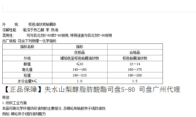 功用作用:为失水山梨醇与不同高级脂肪酸所形成的酯,如司盘-20(SP-20)为月桂酸酯;司盘-80(SP-80)为单油酸酯。有乳化作用。