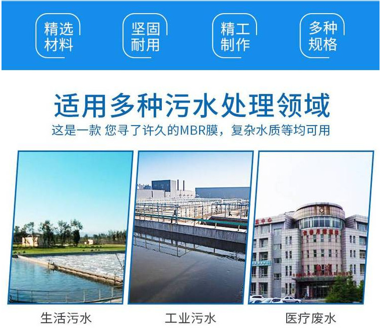mbr制膜技术生产出的高品质平板膜,适用于化工污水、危险废物处置中心污水、医院(医疗)污水、市政污水、农村污水、垃圾渗滤液、轻工和食品行业污水处理与回用领域。