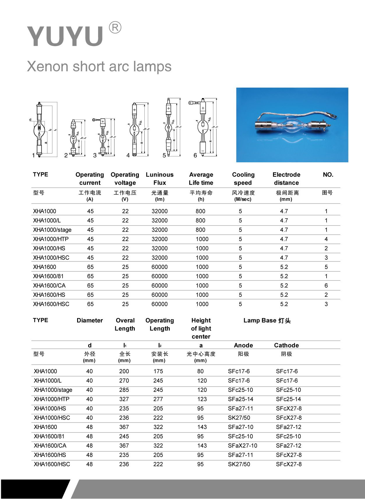 该灯(又称短弧氙灯)是一种具有极高亮度的点光源,色温为6000K左右,光色接近太阳光,是目前气体放电灯中显色性的一种光源,适用于放映、探照、火车车头以及模拟日光等方面。
