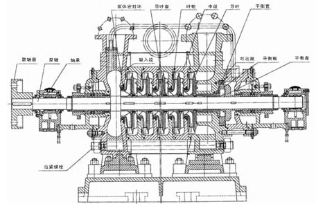 D、DG型泵进、出水口均为垂直向上,通过拉紧螺栓将泵的进水段、中段、出水段、轴承体等泵壳体部分联结成一体。根据泵的扬程选择泵的级数。该系列泵转子部分主要由轴及安装在轴上的叶轮、轴套、平衡盘等零件组成,其中叶轮的数量根据泵的级数而定。轴上零件用平键和轴螺母紧固使之与轴联为一体。整个转子由两端滚动轴承或滑动轴承支承。轴承按型号不同而定,均不承受轴向力,其轴向力由平衡盘平衡。泵在运行中允许转子在泵壳中轴向游动,不能采用向心球轴承。滚动轴承用油脂润滑,滑动轴承用稀油润滑,并用油环进行白润滑,循环水冷却。泵的进水段、中段、出水段之间的密封面均采用二硫化钼润滑脂密封,转子部分与固定部分之间装有密封环、导叶套等进行密封, 当密封环和导叶套的磨损程度已影响泵的工作性能时应予更换。的密封形式有机械密封和填料密封两种。泵采用填料密封时,填料环的位置安放要正确,填料的松紧程度必须适当,以液体能一滴一滴渗出为宜。泵各种密封元件装在密封箱内,箱内要通入一定压力的水,起水封、水冷或水润滑作用。在轴封处装有可更换的轴套,保护泵轴。
